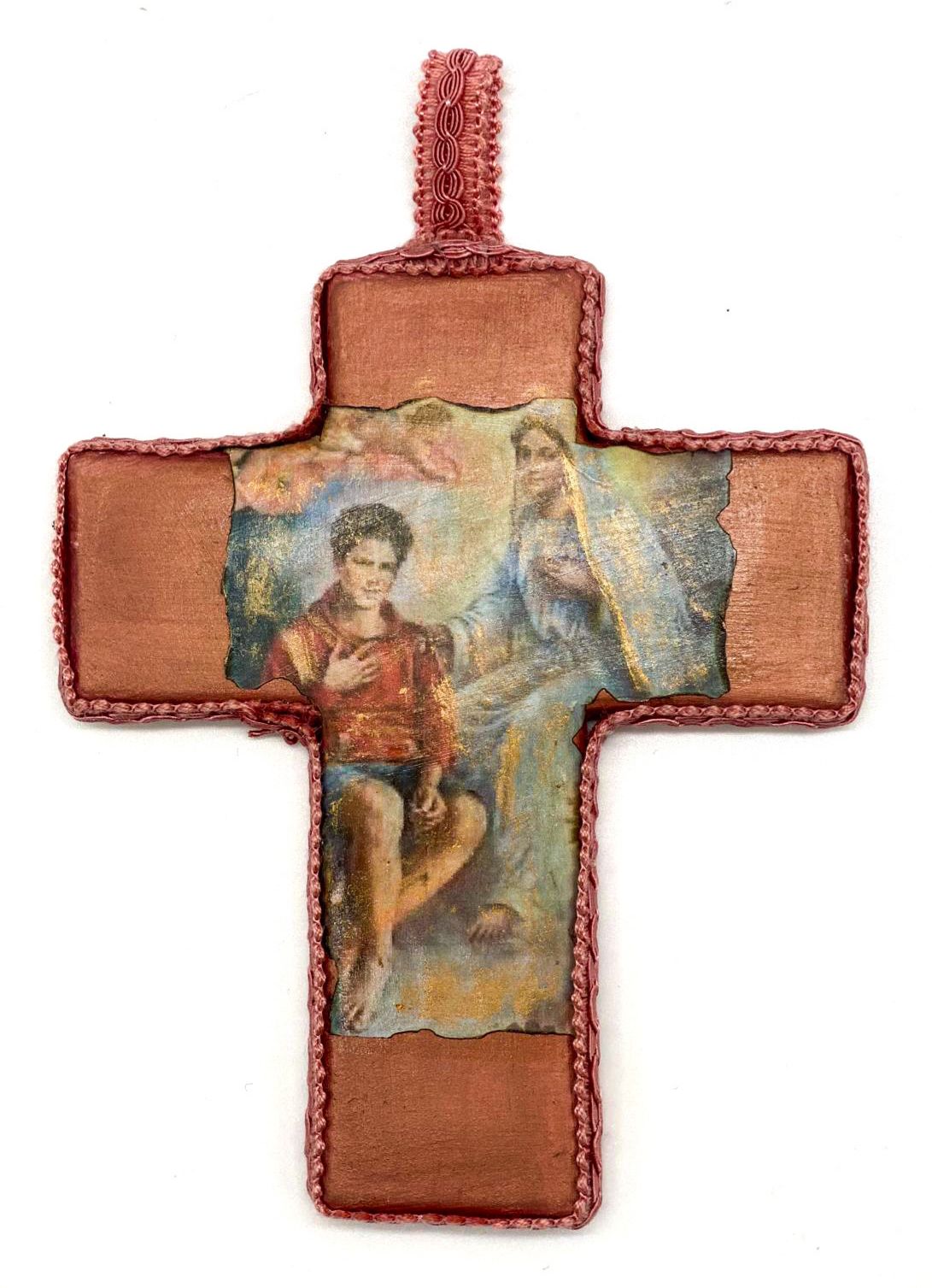 Croci in ceramica realizzate e dipinte interamente a mano, arricchite con la tecnica del découpage per l’applicazione di immagini decorative e impreziosite da eleganti rifiniture in passamaneria.
